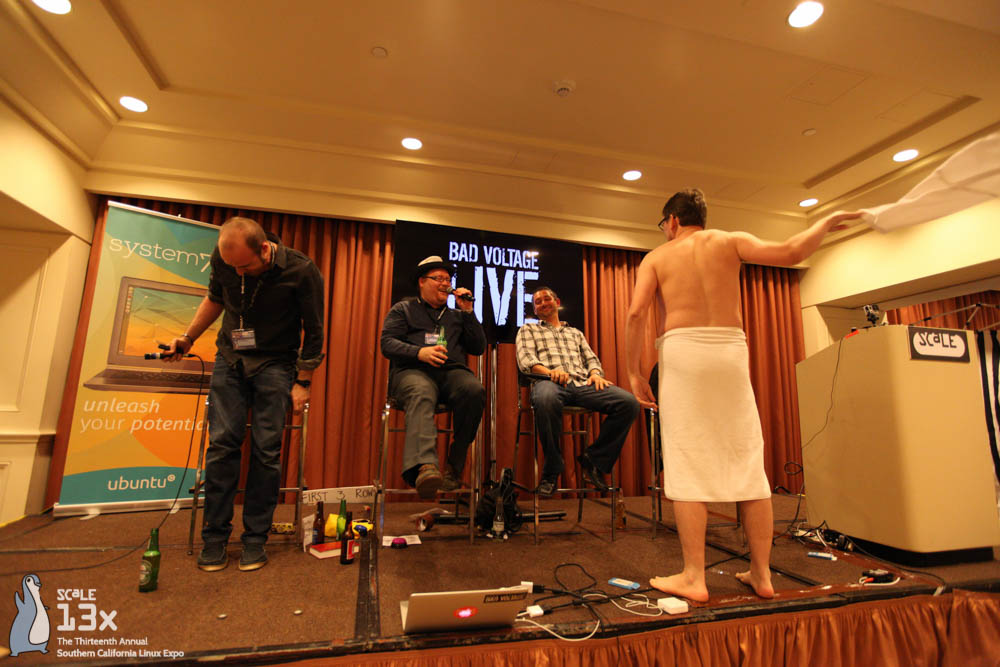 Bryan Lunduke in towel at Bad Voltage Live 2015 while the others mock